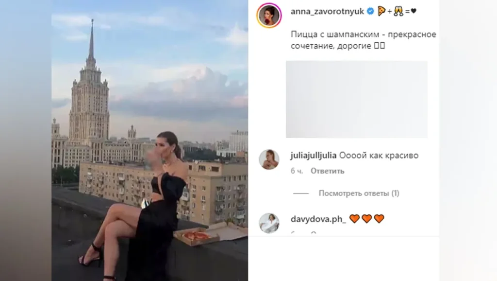 На этот раз Анна опубликовала ролик, сделанный на крыше. На нем девушка сидит с пиццей, а в руках держит бутылку шампанского.