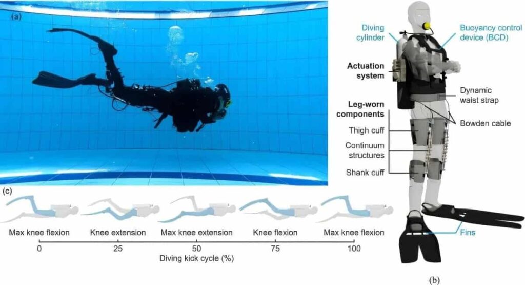 Как сообщает издание Intresting Engineering, компактный экзоскелет сконструирован для поддержки коленных суставов. Благодаря этому новшеству пловцы испытывают меньшую усталость, а их снаряжение расходует воздух более экономно.
