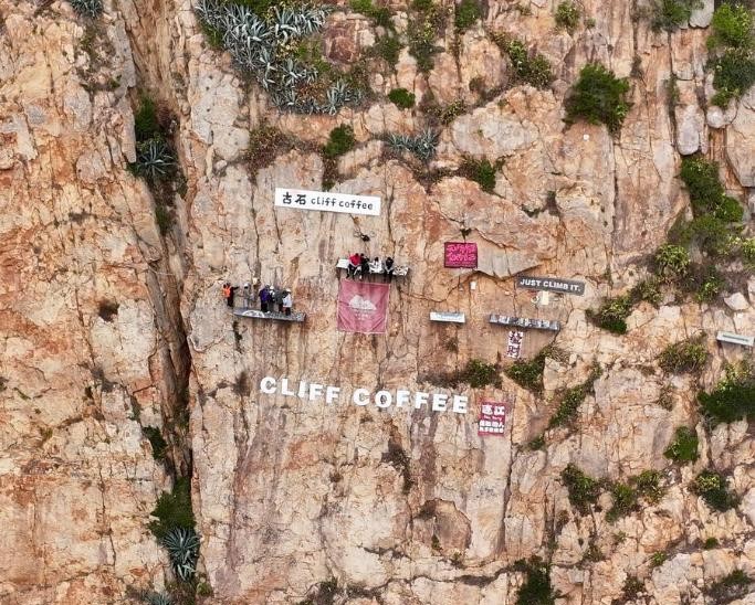 В китайской провинции Фуцзянь открылась необычная кофейня, расположенная на отвесной скале на высоте около 60 метров над уровнем моря, которая стремительно превратилась в вирусную локацию в соцсетях во время празднования Китайского Нового года.