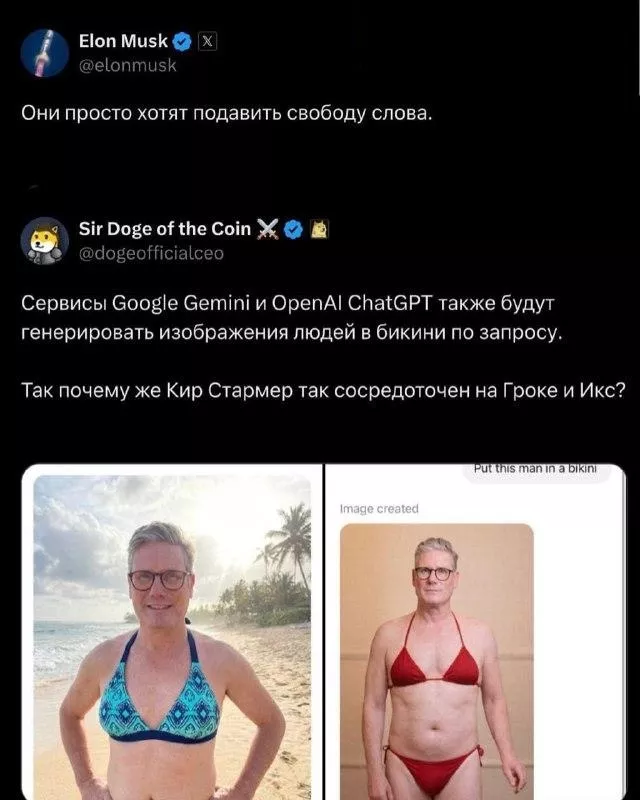 Основатель Tesla и SpaceX Илон Маск спровоцировал новый виток противостояния с властями Великобритании, разместив в соцсети X (прежде известной как Twitter) сфабрикованное нейросетью изображение. На нём премьер-министр Соединённого Королевства Кир Стармер был представлен в откровенном купальнике. К репосту миллиардер добавил резкий комментарий: «Они просто хотят запретить свободу слова».