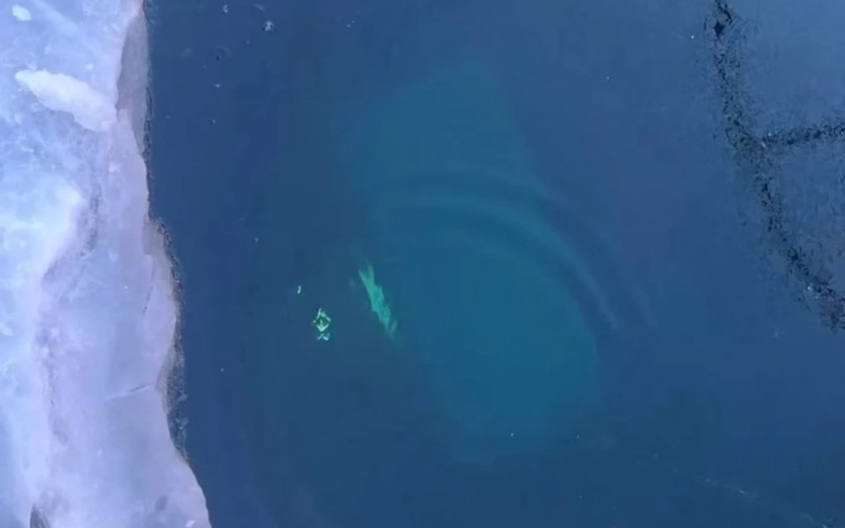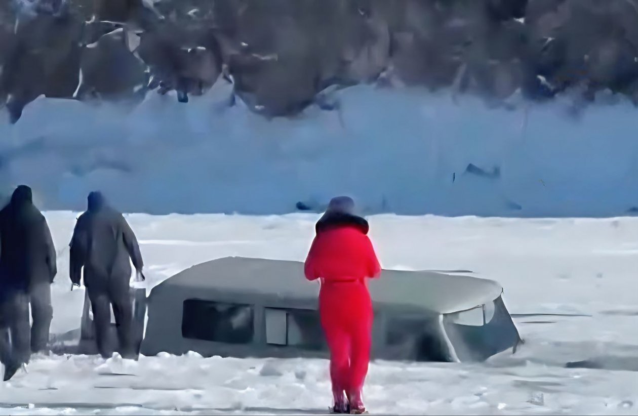 На кадрах, опубликованных в сети, видно, как автомобиль, разогнавшись по льду, пытается «перепрыгнуть» трещину, но в момент прыжка проваливается и стремительно тонет, а находившиеся рядом люди бросаются к промоине, пытаясь спасти людей из салона.