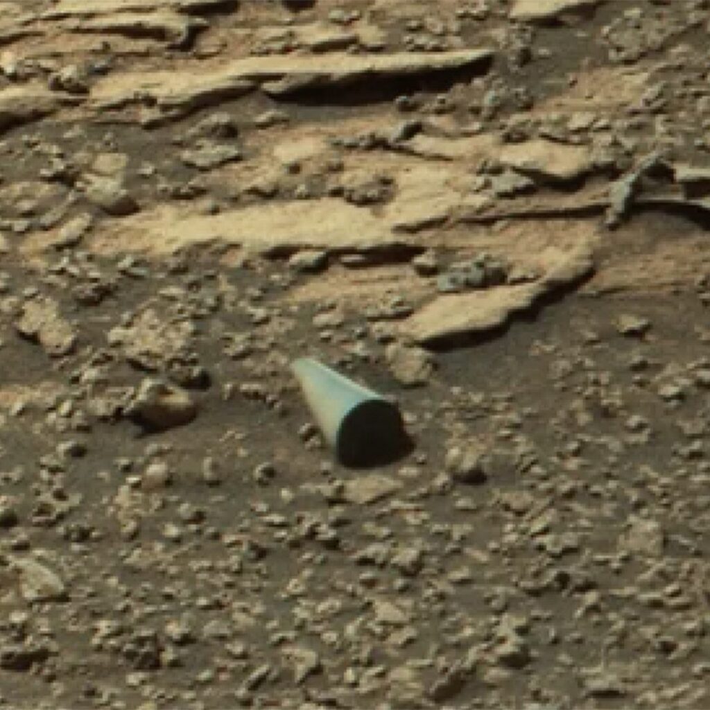 Снимок сделали 8 марта 2026 года в районе Gale Crater, недалеко от экватора Красной планеты. Объект длиной около 20 см блестит на фоне марсианского грунта, напоминая патрон от снаряда.