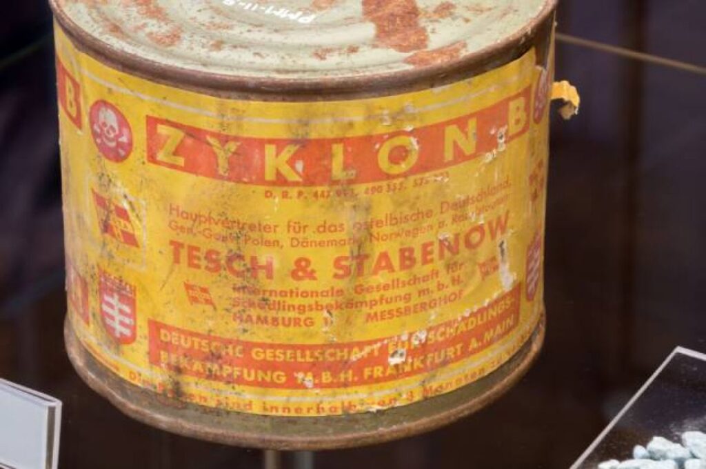«Циклон Б» — это пестицид на основе синильной кислоты, разработанный в 1920-х годах немецкой компанией Degesch для борьбы с вредителями. Во времена Третьего рейха (1933–1945) его переоборудовали в оружие геноцида: газ применяли в газовых камерах Освенцима, Майданека и других лагерей. По данным историков, от него погибли около 1,1 млн человек, в основном евреев. После войны использование такого газа стало символом нацистских преступлений — его остатки нашли в руинах лагерей, что сыграло ключевую роль на Нюрнбергском процессе.