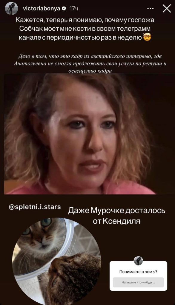 В доказательство своих предположений Боня выложила кадр из интервью Собчак, сделанный для иностранного СМИ, на котором она очень плохо выглядит. Виктория намекнула, что «блондинка в шоколаде» регулярно прибегает к услугам ретуширования кадров, чтобы улучшить свою внешность.