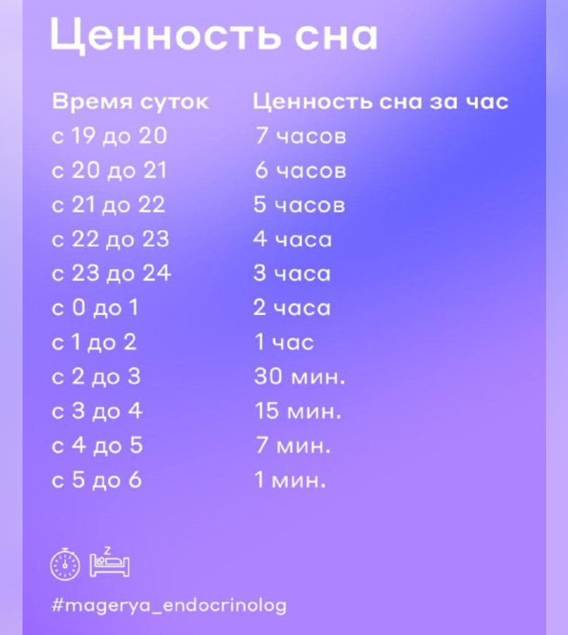 «Согласно исследованиям по эффективности сна, в среднем для полноценного восстановления сил человеку нужно 12-14 часов (по таблице ценности сна). Для этого не нужно спать все 12 часов, нужно просто знать, в какое именно время стоит это делать», — отметил специалист.