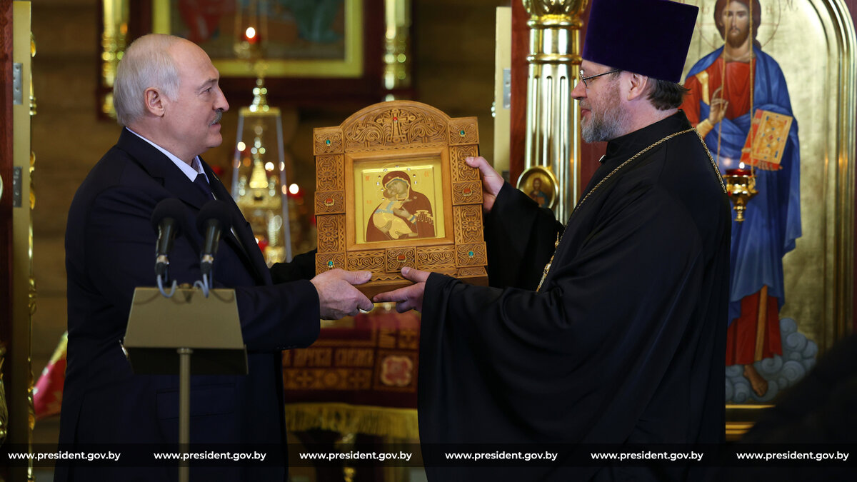Лукашенко подарил храму Святителя Николая Чудотворца икону Божией Матери «Владимирская» и получил в ответ образ святителя Николая