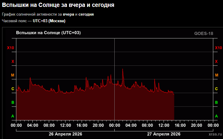 Напомним, накануне ученые зарегистрировали 14 обычных вспышек класса С, а 24 апреля – вспышку X2.5, сопровождавшуюся крупным выбросом плазмы.
