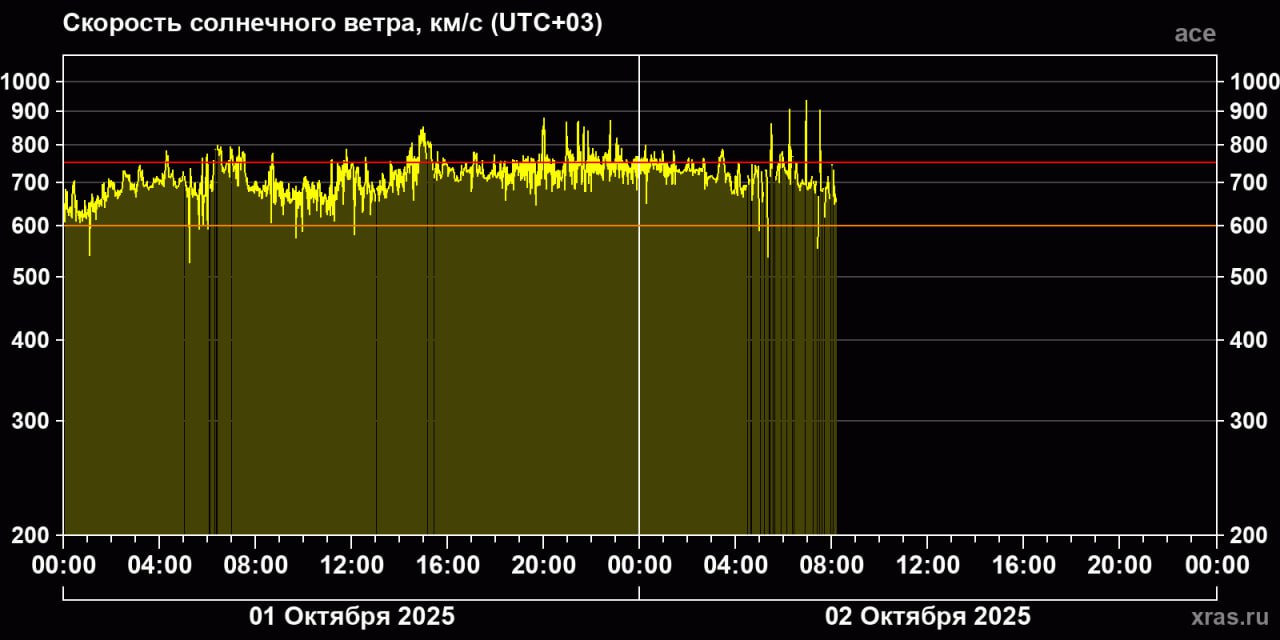 «Буря держится в диапазоне G1-G3, то есть большую часть времени находится на среднем уровне с отдельными сильными пиками. Основным фактором, поддерживающим возмущенное состояние магнитосферы, как уже отмечалось накануне, является исключительно высокая скорость солнечного ветра, которая стабильно держится около красной «экстремально высокой» границы в районе 700-800 км/с а временами показывает отдельные пики в 900 км/с», — подчеркивают специалисты Лаборатории солнечной астрономии ИКИ и ИСЗФ РАН.