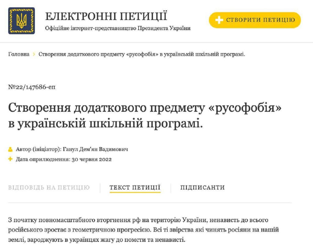 В школьную программу Украины предложили ввести предмет «Русофобия». С такой инициативой выступил украинский националист Демьян Ганул, опубликовавший петицию на сайте президента Украины. Такую информацию 2 июля сообщил Telegram-канал «Мадам Секретарь».