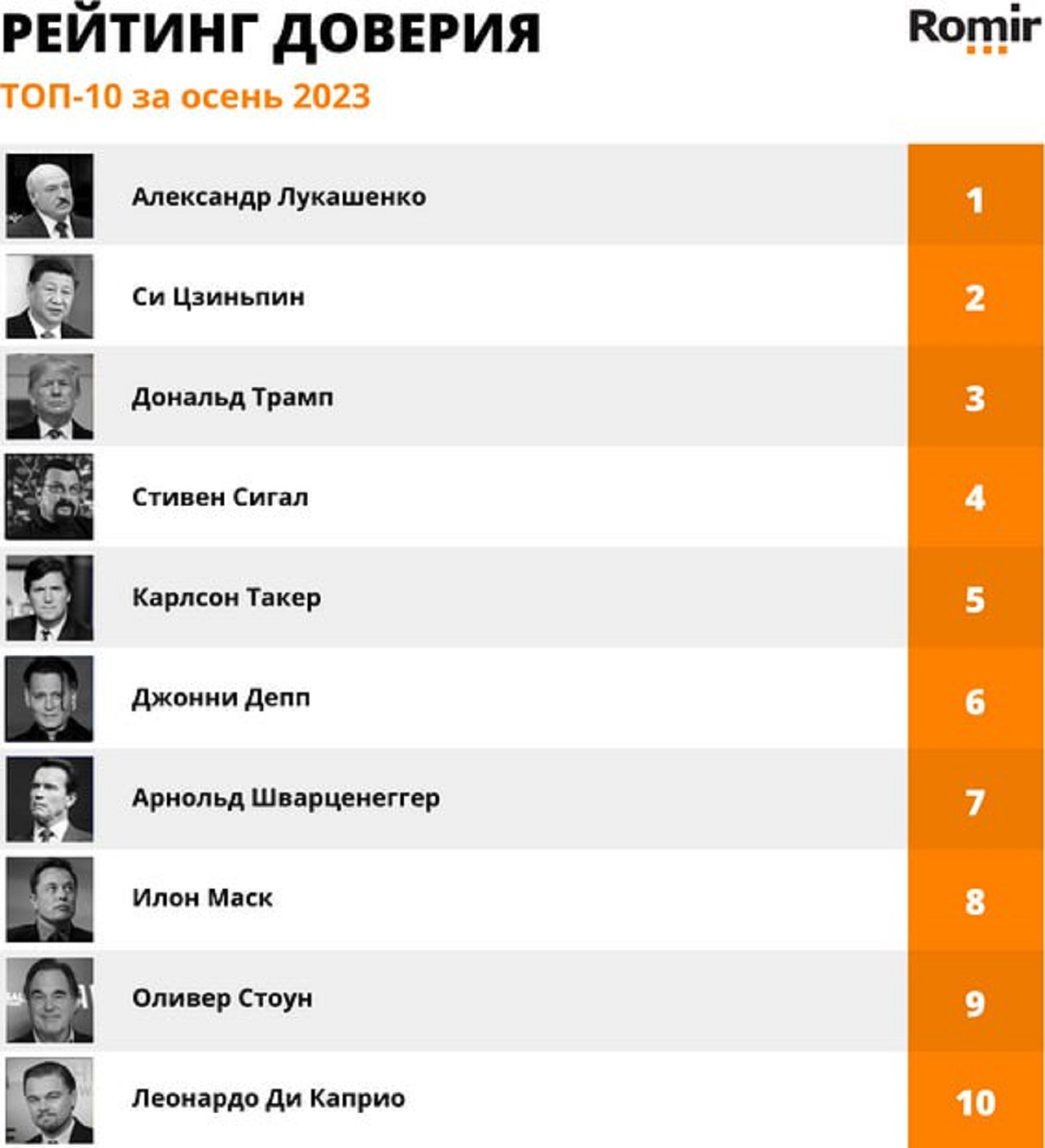 Вопрос, который задавался им, звучал так: «Кому из публичных зарубежных личностей Вы доверяете? Назовите 7 человек, где первым будет тот, кому Вы доверяете больше всего».