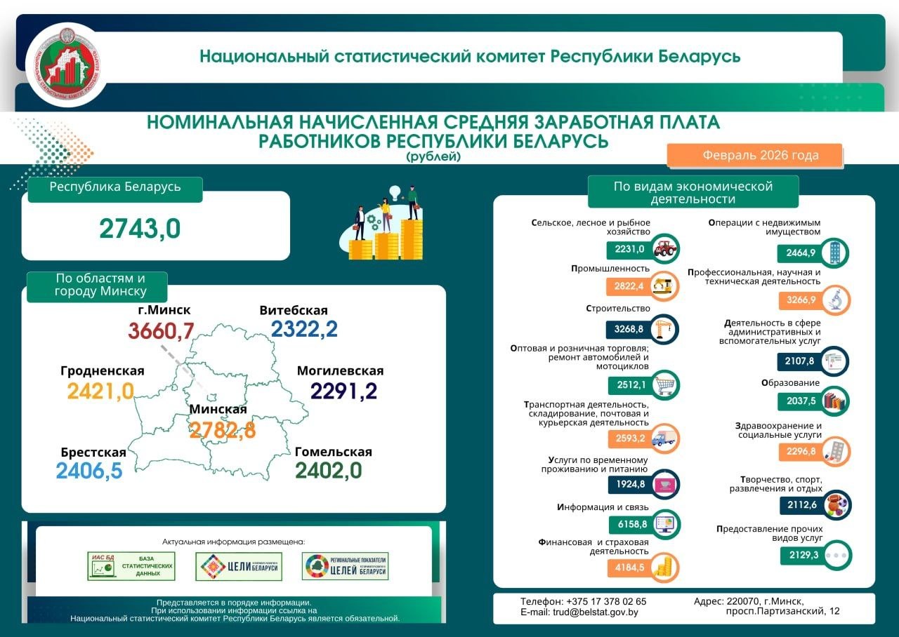 По оперативным данным Белстата, в феврале 2026 года номинальная начисленная средняя заработная плата работников по стране достигла 2743 бел. рубля, что на 14,1 рубля меньше, чем в январе (2757,1 рубля).