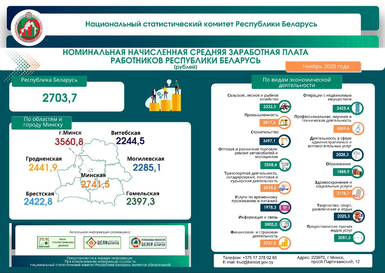 «Номинальная начисленная средняя заработная плата работников Республики Беларусь в ноябре 2025 года составила 2703,7 рубля», — говорится в сообщении Белстата.