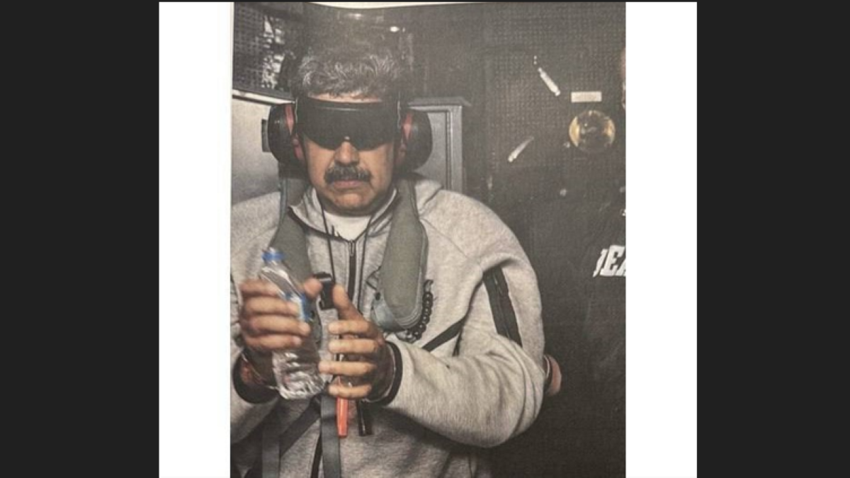 На фотографии, сделанной на борту вертолётоносца «Иво Джима», Мадуро запечатлен в спортивном костюме, с бутылкой воды. На его лице – маска, на голове – наушники, а на руках – наручники.