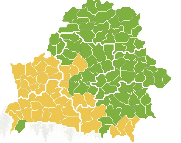 - Брестская область: почти вся область в режиме ограничений, исключение — только Малоритский район.