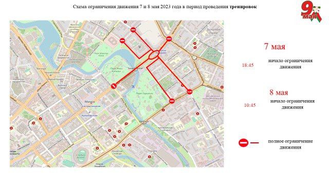 «В связи с подготовкой к праздничным мероприятиям, посвященным Дню Победы, в центре города временно закроют движение. 7 мая временное ограничение движения вводится с 18.45. 8 мая временное ограничение движения вводится с 10.45», — говорится в сообщении, опубликованном пресс-службой столичного ГАИ.