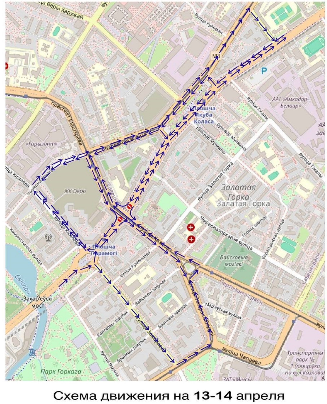 При этом, в последующие сутки, с 5:00 14 апреля до 5:00 15 апреля закрывается движение для всех видов транспорта на проспекте Независимости от Козлова до бульвара Мулявина и частично — со стороны площади Победы с сохранением поворота на улице Козлова.